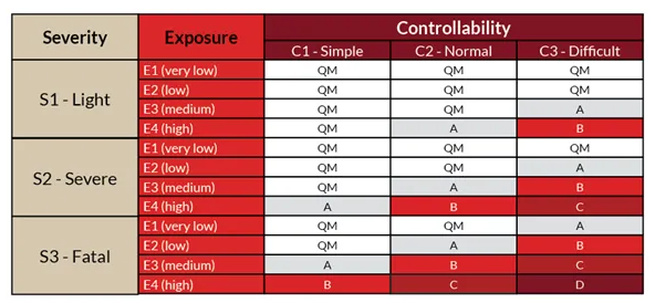 세 가지 매개변수를 조합하면 아래 표에 설명된 대로 ASIL 수준이 결정됩니다.