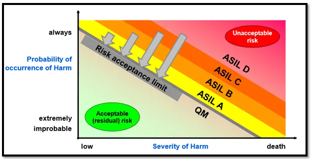 ASIL은 ISO 26262 규정 준수의 핵심 요소이다. ASIL은 개발 과정의 시작 시에 결정된다. 시스템의 의도된 기능이 가능한 위험 관점으로 분석된다. ASIL은 "오류가 발생하면 운전자와 관련 도로 사용자에게 어떤 일이 발생하겠습니까?"라고 질문한다.