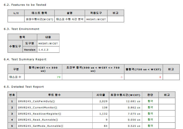 - 소프트웨어 정적 분석 (SSAT): 함수 API 사용 규칙 준수와 전역 변수 초기화를 검사하고, 경쟁 조건 및 재귀 호출의 존재 여부를 검사한다.