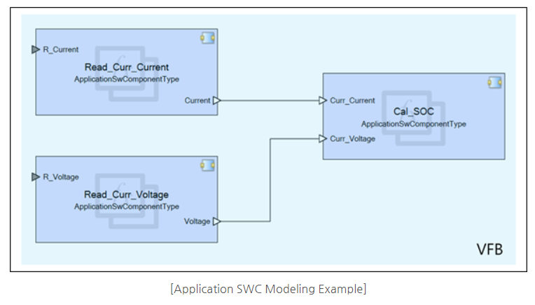 예시로 BMS라는 제어기를 만든다고 하면 BMS에는 현재 전류와 전압값을 읽고 이를 기준으로 잔여 충전양을 계산하는 기능이 있을 것이고, 이러한 기능들을 Read_Curr_Current SWC, Read_Curr_Volate SWC, Cal _SOC_SWC와 같이 생성하여 Application을 구성할 수 있다.