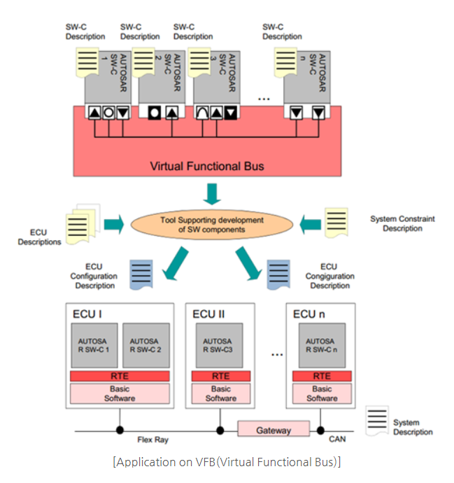 Application은 Virtual Functional Bus (이하 VFS)라는 가상의 공간에서 Software Component(이하 SWC)라는 단위로 개발한다.
