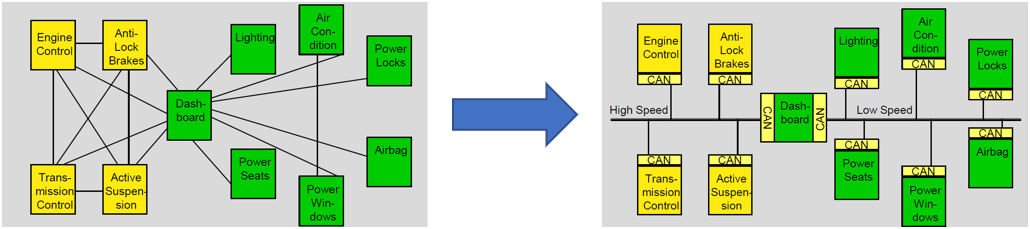 시간이 지나 ECU의 숫자는 점점 늘어나면서 배선의 길이가 길어지고, 이에 따른 비용과 무게가 증가했다. 차량에서는 제작 비용도 민감하지만 무게에 대해서도 상당히 민감하다. 이 문제를 해결하고자 자동차 업계에서는 CAN통신을 도입(벤츠가 가장 먼저 상용차에 적용)하였으며 현재 산업 통신에서는 모든 차량에 CAN통신을 사용한다고 봐도 과언이 아니다.