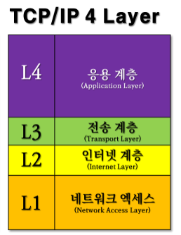 TCP/IP 4계층의 구조는 네트워크 엑세스 계층(Network Access Layer), 인터넷 계층(Internet Layer), 전송 계층(Transport Layer), 응용 계층(Application Layer)으로 구성되어 있다.
