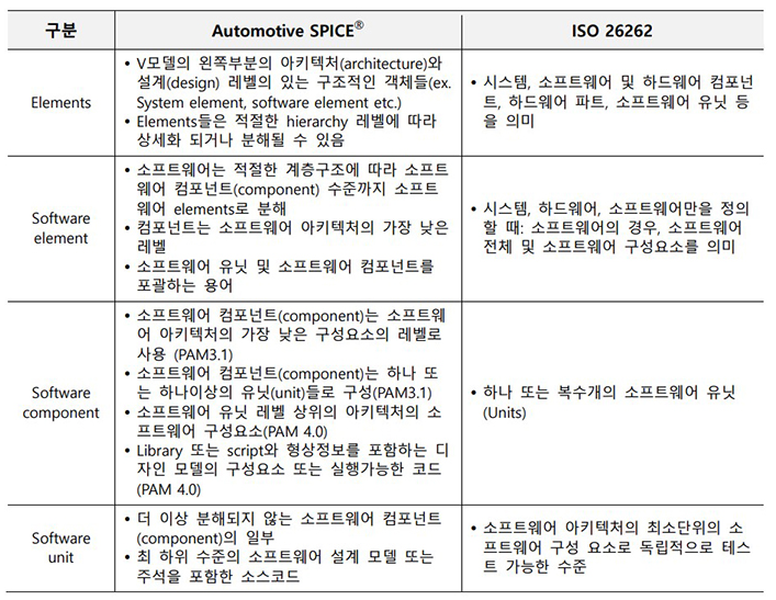 ISO26262 와 ASPICE에서 요구하는 소프트웨어를 구성하는 용어를 정의하면 아래와 같다.